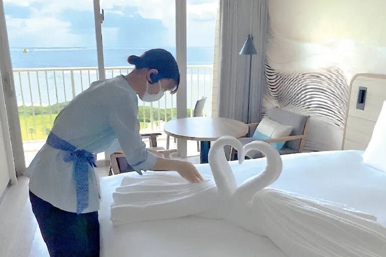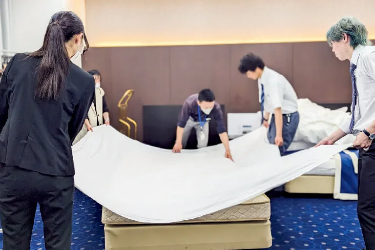 ホテル学科では、学内の実習室だけでなく「本物のホテル」を使用した研修を積極的に行っています。プロが働く本物の施設でさまざまな体験をすることで、ホテル特有の雰囲気や緊張感に慣れることができ、就職後すぐに自分の実力を存分に発揮できます。また、多種多様な実践経験を重ねることで、仕事への意識や責任感を身につけることができます。