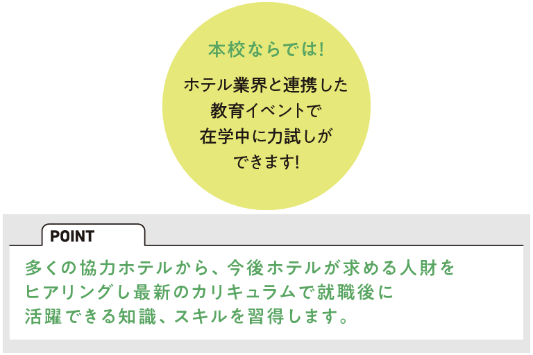 プロが働く本物の施設でさまざまな体験をすることで、ホテル特有の雰囲気や緊張感に慣れることができ、就職後すぐに自分の実力を存分に発揮できます。