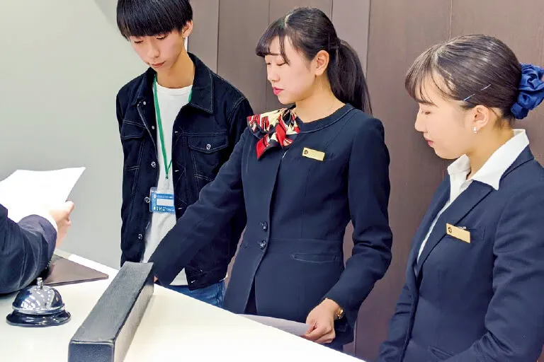 ドア、ベル、ハウス、フロントなど、それぞれの業務、立ち居振る舞いや正しい言葉遣いを身に付けます。2年生になるとホテルで実際に使用されている宿泊予約システムの使い方やコンシェルジュとして身に付けるべき教養やお客様へのご提案の考え方などを学びます。