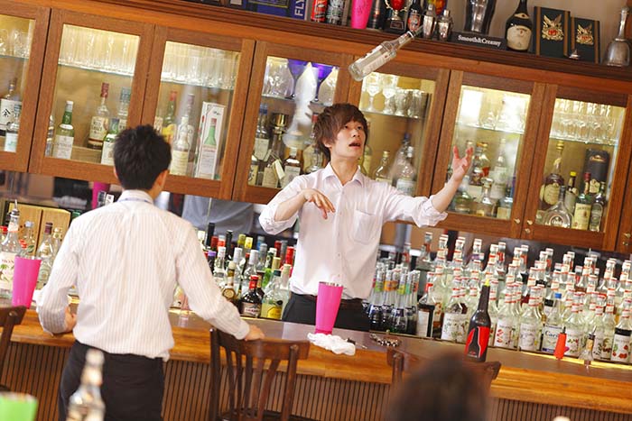 ボトルやカップを手や腕の上で回転させ投げたりしながらカクテルを作成するフレアバーテンダー。