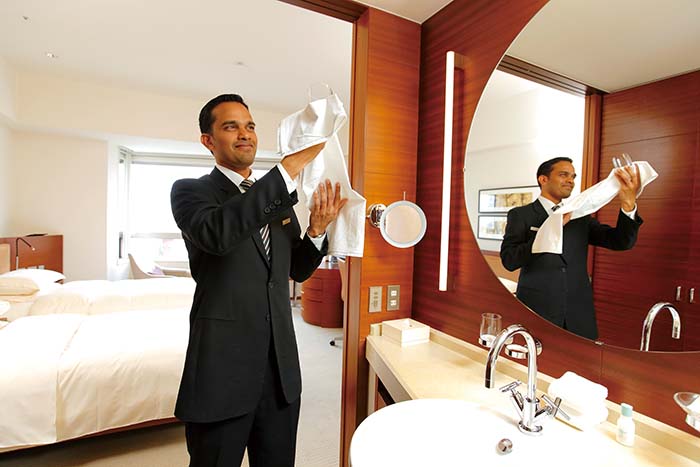 ベル、フロント、ハウスキーピングの業務を実際のホテルと同じ設備を使用して学びます。一流講師陣と共にロールプレイを取り入れながら行う授業です。